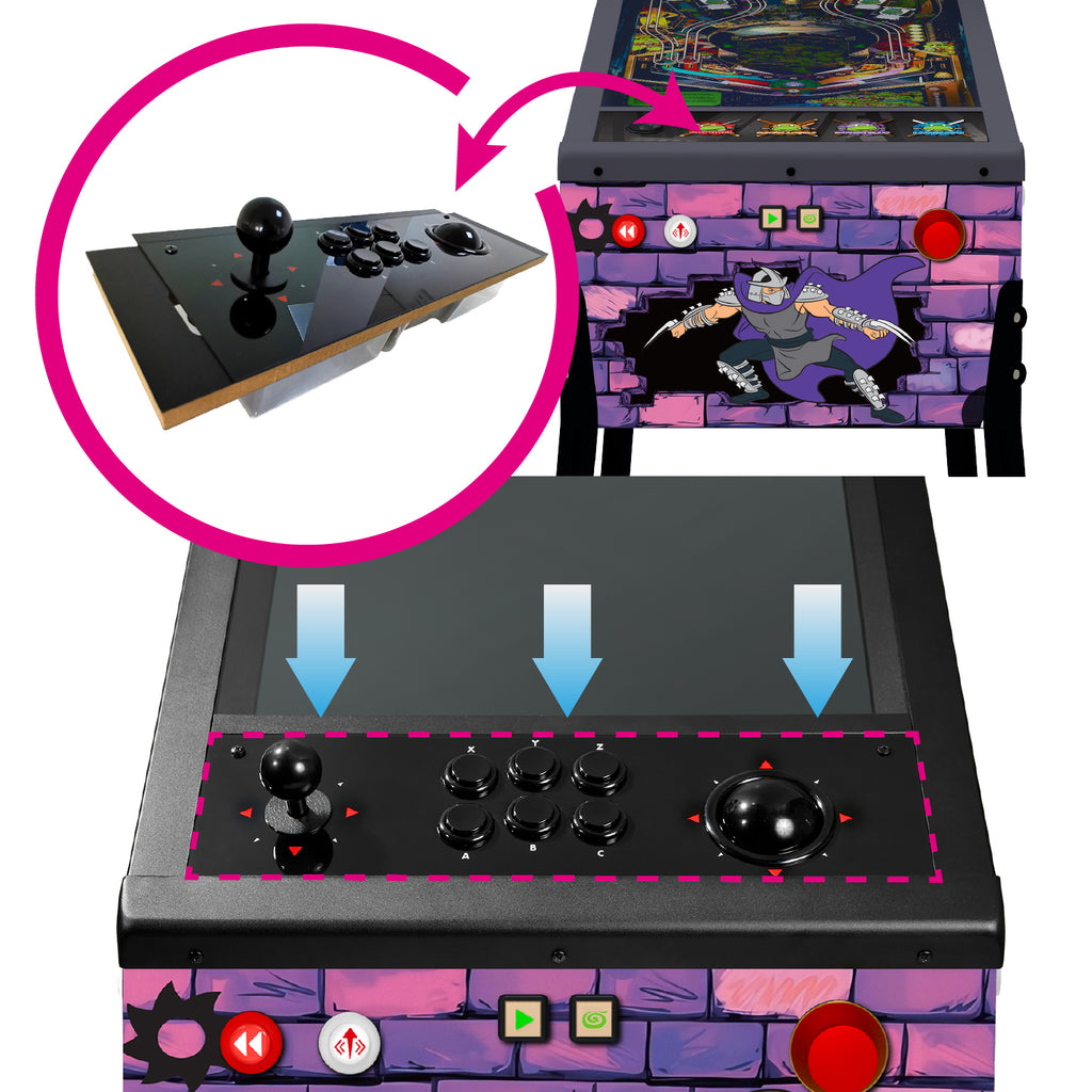 Expand your AtGames Legends Pinball HDP™ TMNT to the ultimate arcade machine with this easy upgrade. Simply drop this Arcade Control Panel into your Legends Pinball HDP™ TMNT to enjoy arcade-quality action buttons, joystick, and trackball control. This is the ultimate way to take full advantage of the pinball machine’s amazing 32” vertical playfield and stereo speakers for a stunning arcade-quality gameplay experience!