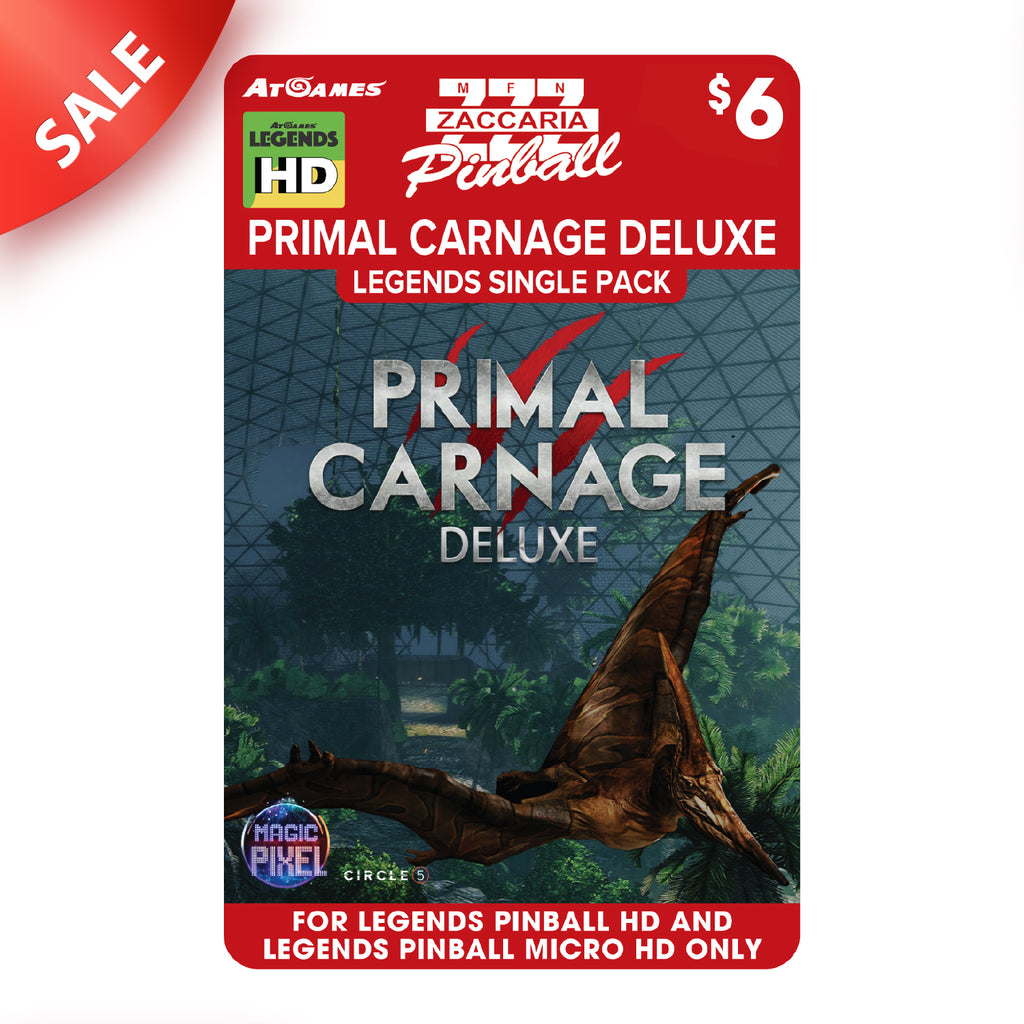 Step into the savage world of Primal Carnage Deluxe, where humans and dinosaurs clash for supremacy! This table features a full array of classic pinball elements, including pop bumpers, slingshots, spot targets, drop targets, spinners, eject holes and ramps. Engage in epic game modes packed with combos, loops, multiball and multipliers, pushing your skills to the limit to achieve high scores. Bringing the prehistoric battlefield to life, the table is enhanced with dynamic and static decorative objects, delivering an intense, immersive and visually stunning adventure!
